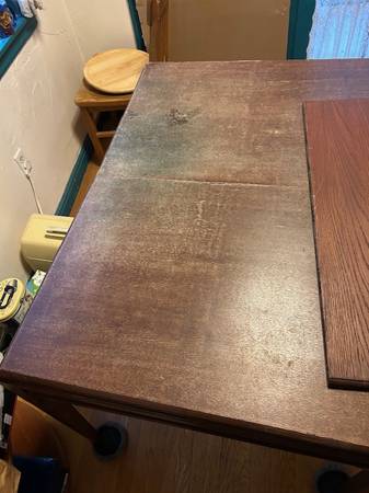 Hard wood dining table with a veneer on the top, and with one extending leaf.