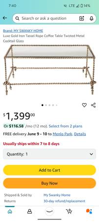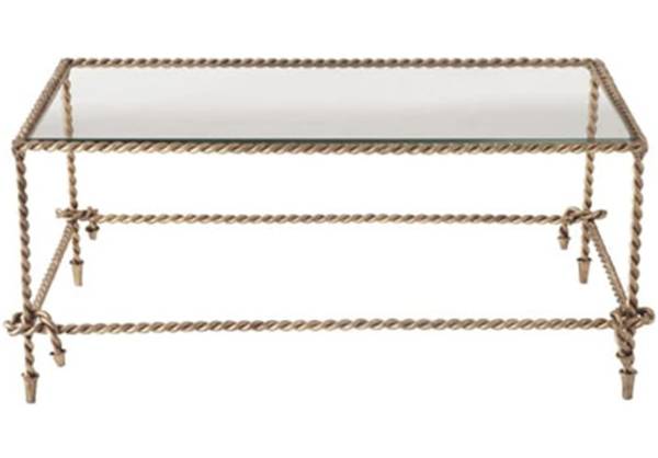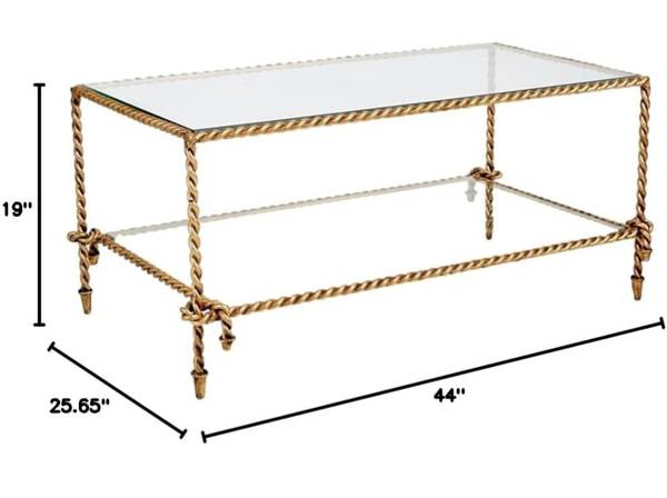Our gorgeous cocktail table has an iron frame designed to look just like rope, complete with knots and tassels. With its rich antiqued gold finish and glass top, this coffee table adds stunning and practical space to any living area. Its practical yet beautiful design would make it a welcome addition to any space.