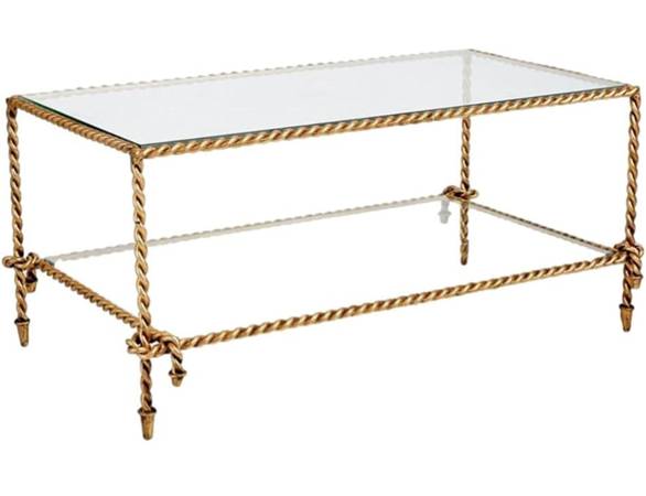 Sold at Neiman Marcus as the "HORCHOW Chloe Coffee Table" or on Amazon as the "Luxe Gold Iron Tassel Rope Coffee Table Twisted Metal Cocktail Glass Table" by My Swanky Home. This table has two glass surfaces.