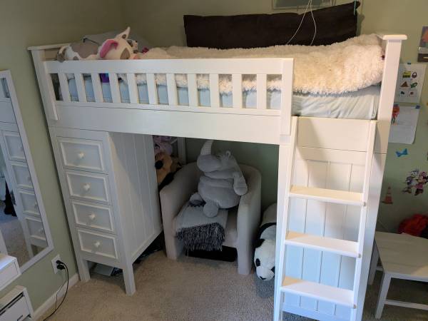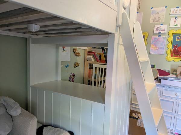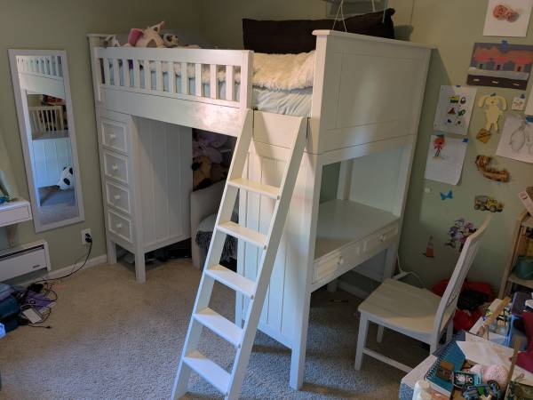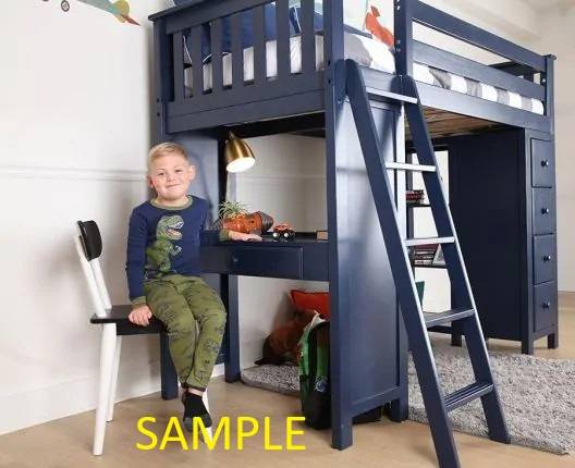 This is a two bed bunkbed/loft for kids, with a built in desk and cabinet. The lower bed can be removed. In my photos we have moved the lower bed to a different bedroom, so my photos don't show them together, but I've added photos from the manufacturer that show how it looks in different configurations. The photos marked "SAMPLE" are from the manufacturer and not my own.