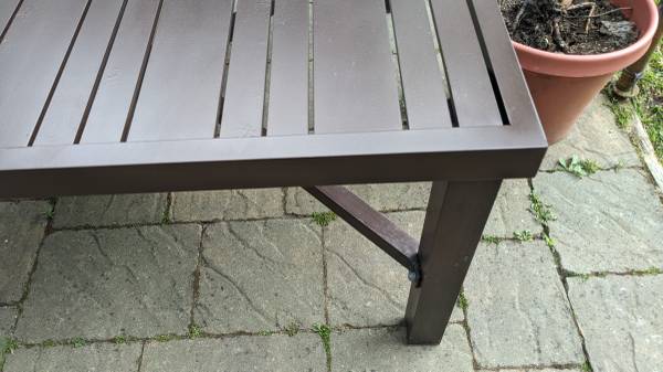 Large Aluminum Patio Coffee Table 36" x 37 1/2" x 19 high. Surface was faded and recently spray painted brown. Legs are original color, slightly faded. Good condition, sturdy, will not rust.