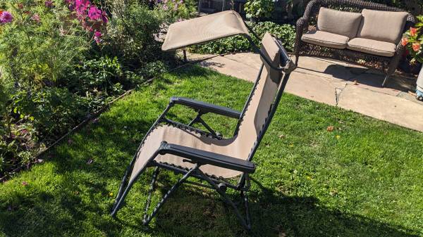Zero Gravity Lounge Chair. Great condition, a little surface rust on the base. Fabric is great condition. Visor is adjustable and flips out of the way when not needed. Reclines fine and has 2 locks....