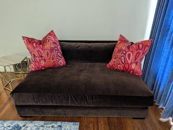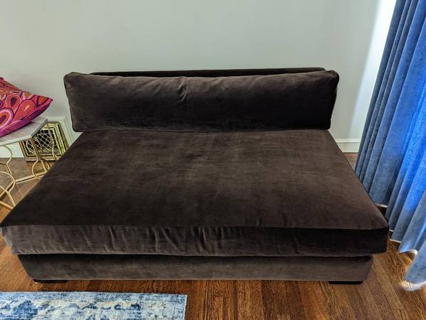 Espresso colored piazza apartment sofa. Delivery available for extra charge. Plus a cb2 Cue chair in brown velvet for $250 additional.