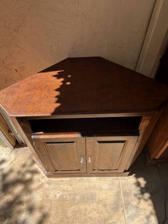 For sale is a custom made solid wood corner armoire/entertainment center/TV cabinet. Brushed nickel hardware. Excellent condition. Located in downtown Palo Alto.