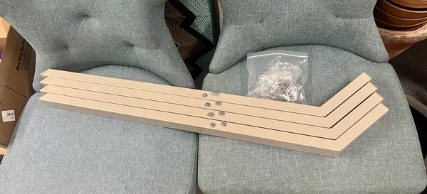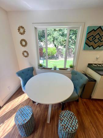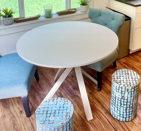 NEVER USED table. Purchased for staging an apartment then tenant did not need apt furnished. Table now disassembled and ready for pick up. 4 metal legs and all hardware included. Excellent modern table to add an accent to any dining room or studio apartment.