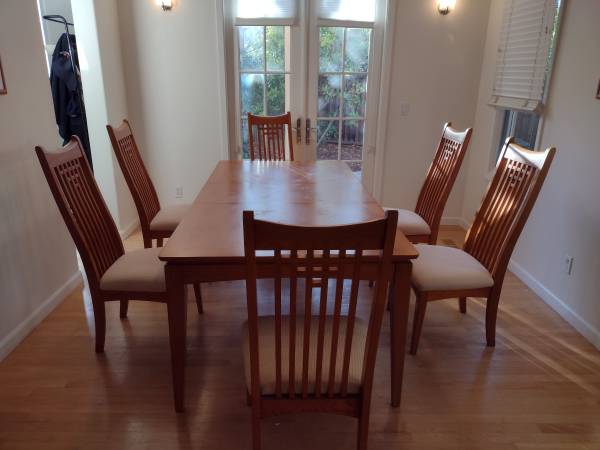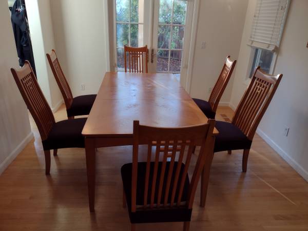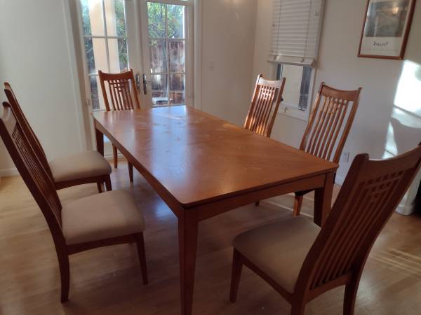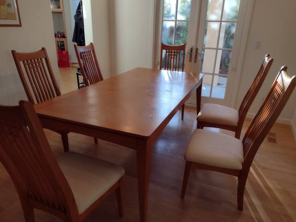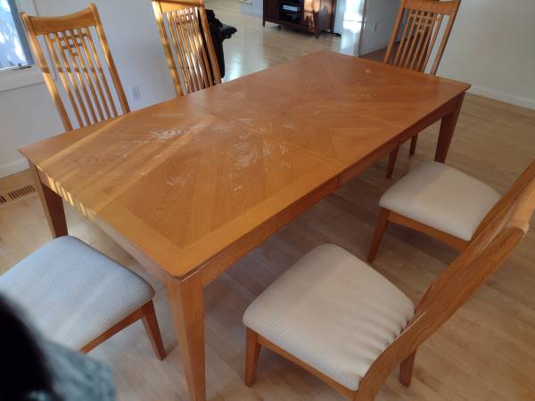 Used oak dining table with 6 matching chairs. Table is 42" x 64" and includes 20" extension leaf (42" x 84" total). Chairs have light beige upholstery. Also included are 6 dark brown chair covers.