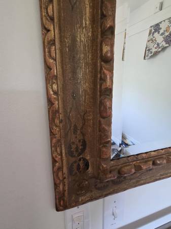 This mirror was custom made with beveled mirror and custom-antiqued frame. It is large and meant to be used over a fireplace mantel but would be equally lovely over a sideboard or low china cabinet. Originally $3900. Imperfections in frame are original to the material.