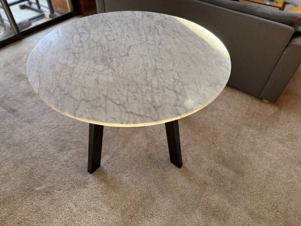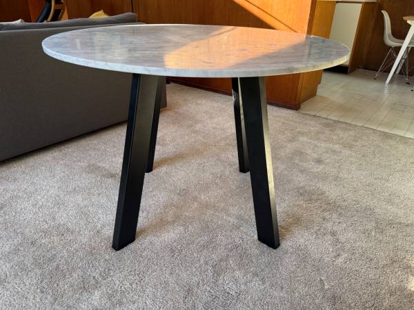 Article real Carrara marble 42" round dining table. The table in a good overall condition however it has some surface scratches and stains visible under certain lighting which is reflected in the price. I never noticed surface nuances until the wife pointed those out after we decided to sell the table.
