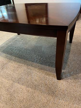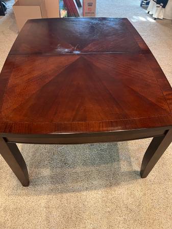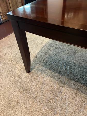 Beautiful solid wood dining table (originally bought from Macy’s Furniture, San Mateo). PLUS matching mirror (see pictures)! 44” wide by 60” long and height 29” Asking $50 No stairs; easy take away