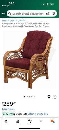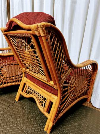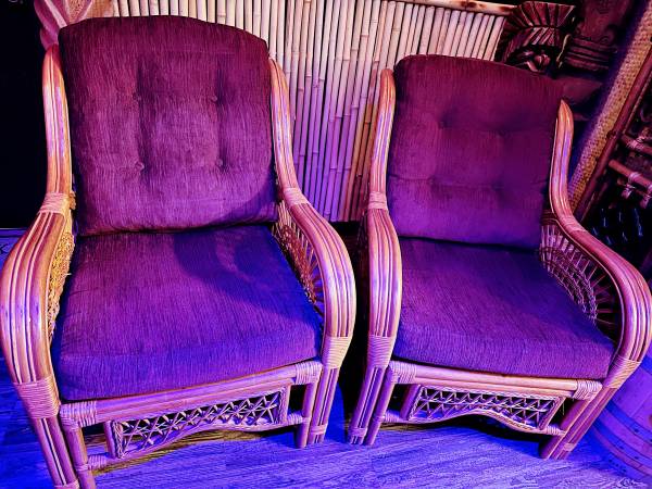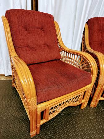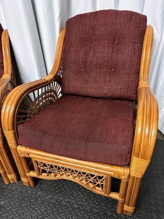 Paid $290 ea, selling $60 each. Excellent, lightly used condition. Non smoking home. SunBear Furniture Lounge Malibu Armchair ECO Natural Rattan Wicker Handmade Design with Maroon Cushion, Cognac...