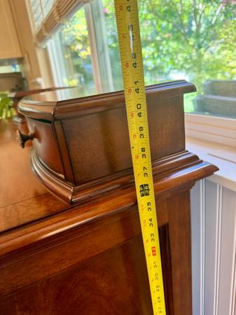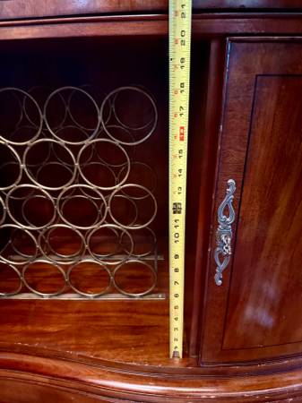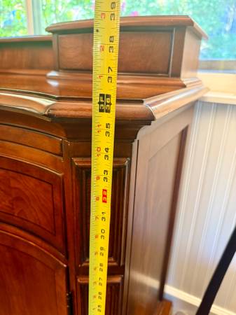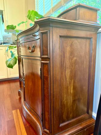 Great solid wood cabinet/credenza - useful as sidebar or dry bar. Has a pull out shelf, one big drawer with nice lining (e.g. for cutlery), and lower cabinets. One with wine storage - that side holds 20 bottles, the other at least that many below the shelf (which has adjustable height). 45" wide, 36" tall to main top; 41" including the 2 small side drawers, and 21" deep. Minor wear; solid wood construction. Online I found a very similar piece listed on Cherish for $1995... this one is $220. If this ad is up, it's available! Cross posted. Thanks.