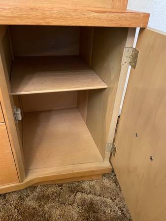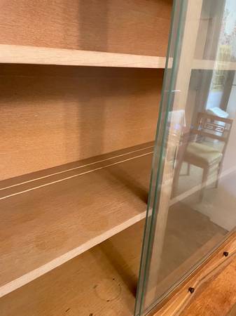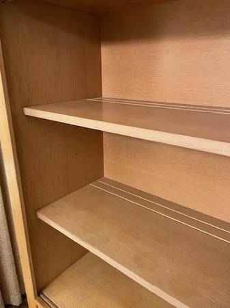 - Upper display section with three wood shelves (spacing: 9½", 11", and 10½")