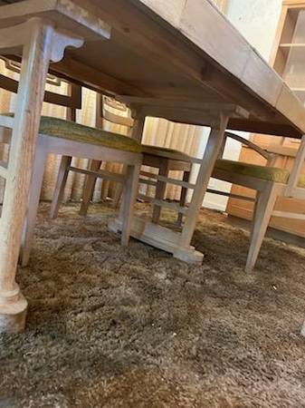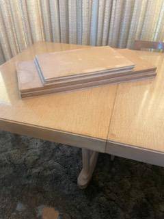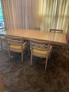 Timeless elegance meets classic craftsmanship in this vintage Mid-Century Modern dining room set, circa 1950. Made from solid hardwood—likely blond oak—this American-made set includes: