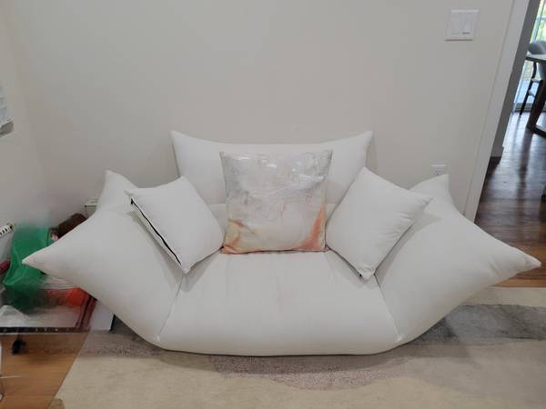 Priced for quick sale! 2 white wood night stands -60 Crate and Barrel bronze w/gold trim round mirror.- 80 Urban Outfitters Cirrus White Convertible Floor Chair/Sofa (65×33 chair style, folds flat...