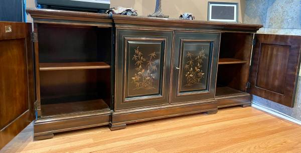 This is a beautiful, classic solid-wood sideboard/credenza made from heavy, high-quality wood. Elegant lines with great presence - a truly well‑built, expensive piece of furniture.