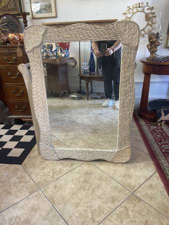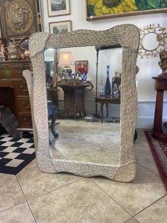 Pier1 Jamaica Collection Mirror – Wicker & Wood, Whitewashed Finish Details: Original whitewashed finish Wicker and wood frame Size: 26.5" W (top) / 27" W (bottom) x 37" H Condition: Used, Good...