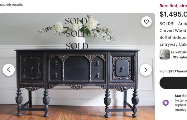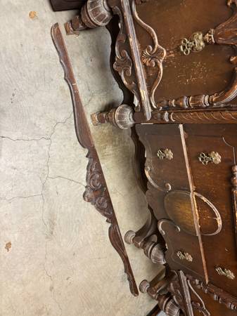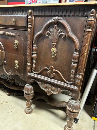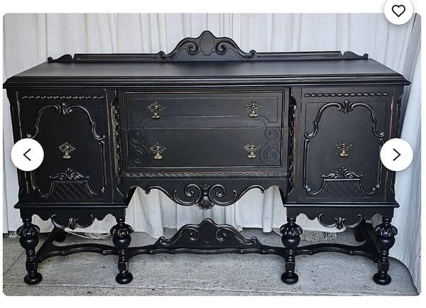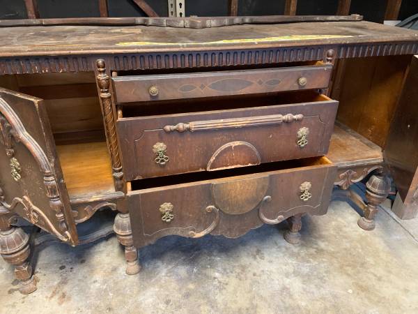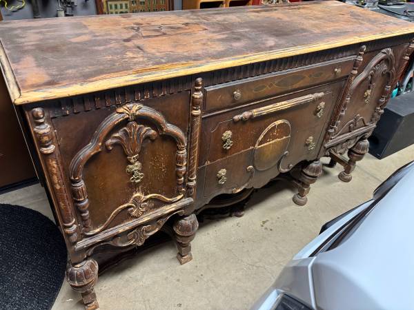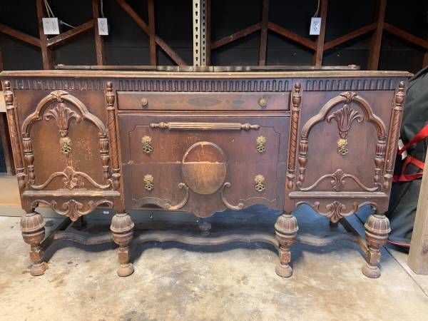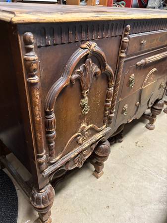 This solid, sturdy old Jacobean walnut(?) wood piece of furniture could be beautiful. See similar ones painted in these pics (and selling for $$$) Great for family room, dining area, wide hallway, or take it on location, so many creative ideas for use.