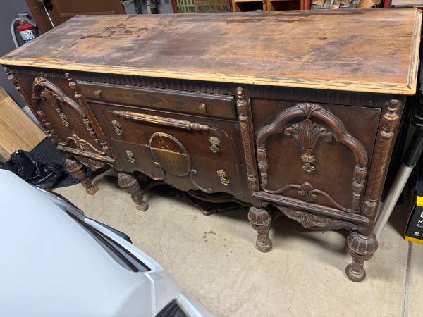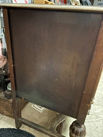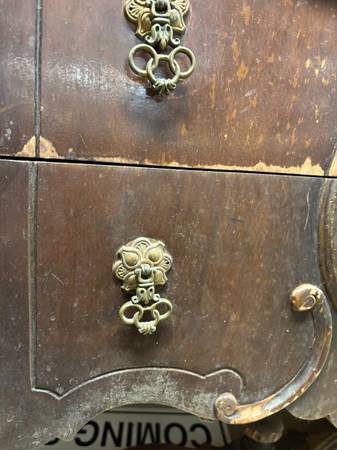 Front decoration has small chip, left door has chipped area, top cornice decoration needs to be screwed on, a bit of lifted wood veneer. (possible to wood patch, or re-sheet with wood veneer, or fill and primer)