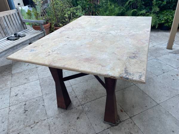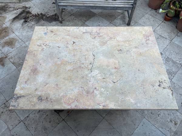 Selling this sturdy one of a kind custom built outdoor table. The top is a slab of unpolished marble, travertine or similar. The corners are rounded and have a few minor chips. The table is in great shape and will serve you well for outdoor dining. Easily seats six people.