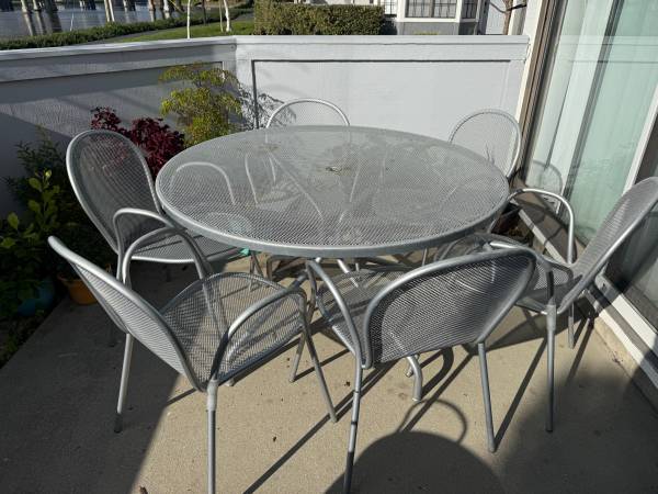 Nice Patio metal (Aluminum) Round Table (48") with center hole for umbrella, and 6 Aram Chairs. Umbrella is not included. $225. Cappuccino Oval, Top Glass coffee table with wooden base and 2 Round...