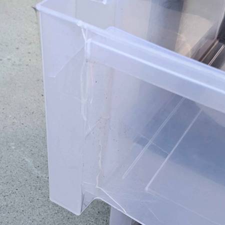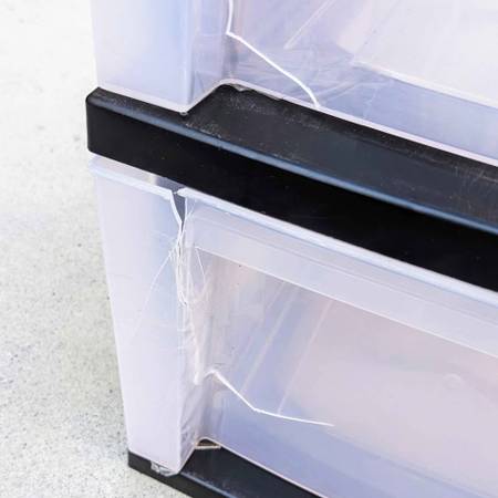 Selling a pre-owned 8 layer 40 inch tall plastic drawer organizing chest. Features 6 thin drawers and 2 thick drawers for a total of eight. The two bottom deep drawers are damaged and have been taped. They function just fine (see close-up photos).