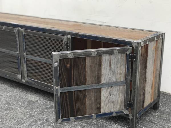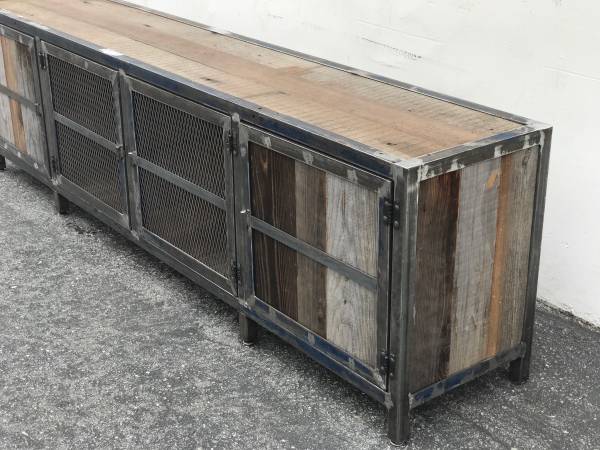 Modern rustic media console. Industrial steel base 84x16x20 Credenza, cabinet, media console, hutch, Entertainment center, tv stand, rustic, industrial, reclaimed, redwood, steel