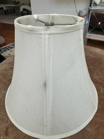 Classic bell shaped fabric lampshade made by Stiffel (high quality lampshades). 11” high, 7” diameter on top, and 14” on bottom. It is structurally in excellent condition; has some stains and discoloration from age(see photos). Spider fitting. Versatile decor style- vintage, classic, transitional, MCM.