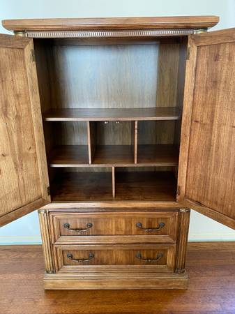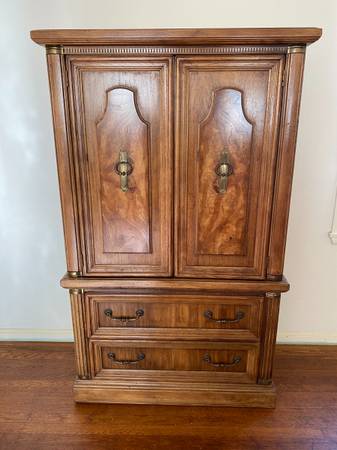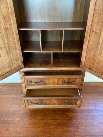 Wood dresser/cabinet with two drawers. Good condition. 37" wide, 62" tall, 18" deep. If add is up dresser is available. See my other listing for matching 9-drawer dresser with mirror: