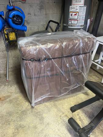 36 inch Wide Transitional Square Coffee Table Storage Ottoman in Distressed Umber Brown Vegan Faux Leather.