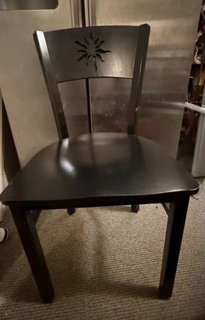 Black wooden chairs great for indoor casual seating Dark stained/painted with metal legs and plastic bottom pegs that prevents scratching floors. Has the beautiful Tangled Sun Starbucks design...