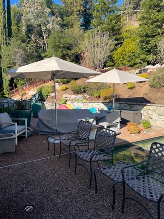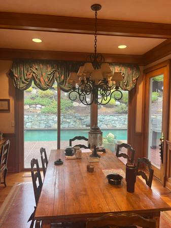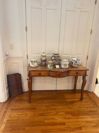 lovely dining sets, harvest table w 8 ladder back chairs, French provincial sofa table, lovely burled secretary w domed crown and doors and ornately fitted interior, cherry display cabinet w beveled glass doors, 19c wooden dental chair replica in the style of RH, large ornate entry mirror, painted game table, nice sectional sofa, large 4 x 4 map cabinet style coffee table, several upholstered club chairs, room size wool needlepoint carpet, 10 x 13 Tabriz rug, oval burl wood dining table w 8 highback tapestry chairs, corner cabinet, marble top console w ornate iron base, framed artwork - paintings, prints and tapestries , quilt collection, linens, full kitchen - lots of glassware and ceramics including Deruta, electronics - Bose, Denon, big screen TV's, tools, tool boxes, camping and survival equipment, wonderful garden decor - furnishings, large ceramic planters and plants, umbrellas, bird house collection, exercise equipment incl treadmill and stationary bike ....... A FULL HOUSE ! 11.28 thru 11.30 10 till 5 12.01 noon till 5