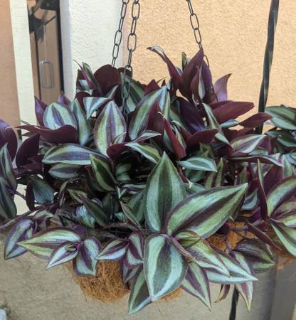 Tradescantia Zebrina in a 10" metal hanging basket with removable coco liner. A piece of plastic was used between the liner and soil so you can easily remove the whole plant and reuse the liner again, as well as to make sure the soil does not dry out too quickly. Beginner friendly - very easy to care for. Can grow outside in planters/baskets/pots or in ground soil (perennial) as well as inside.