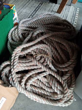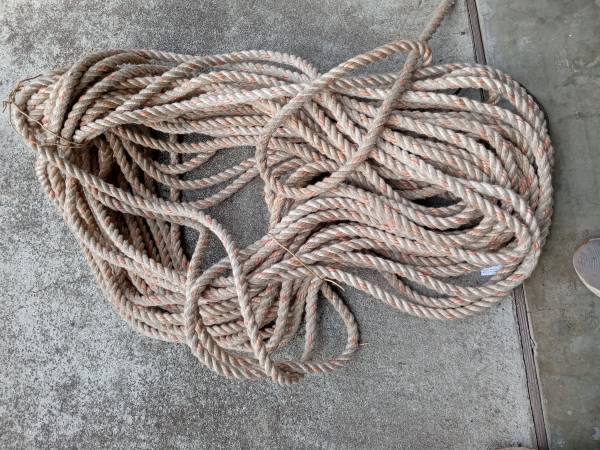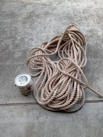 Used a couple of times for tree work. It is in great shape. 100 feet 1". Next to a gallon can to show size. Could be used for a garden project like railings or ?