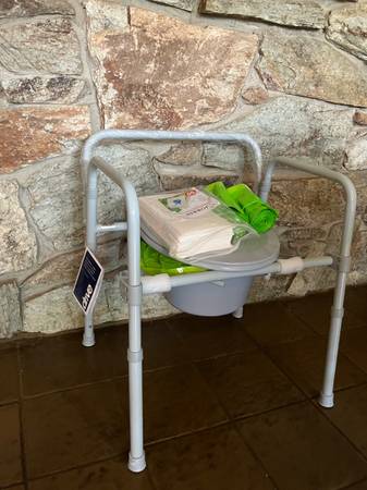 Bellavita bath lift chair, raised toilet seat, shower seat, walker, bedside rail, rolling bedside table, baby monitor, bed alarm, nebulizer, 75 adult diapers S/M, commode with bags and absorbent...