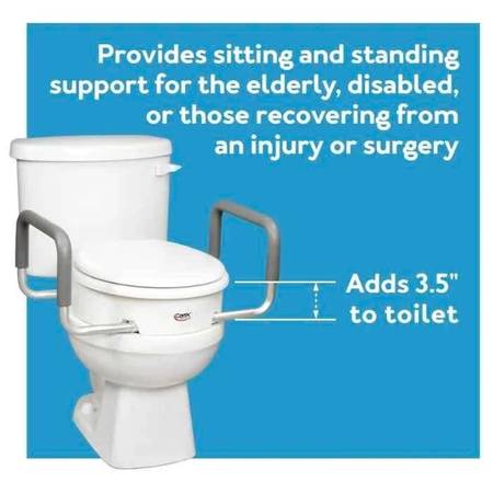 A brand new, never used toilet seat riser with side arms for use with elongated toilets. Adds 3.5 inches of height to standard elongated toilets, providing a stable and elevated seating position.