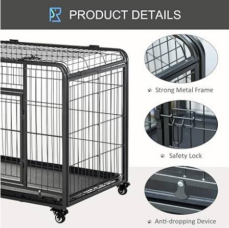 Heavy-duty welded metal construction. Large front door with dual security locks. Top panel opens for easy access. Four rolling casters with brakes. Removable plastic tray for easy cleaning. Much sturdier than standard wire crates.
