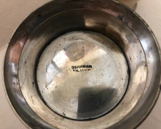 2 Lovely Tradititonal-Shaped German Silver Mugs with etched floral designs 5 inches tall. Thanks for viewing. (Price Reduced)