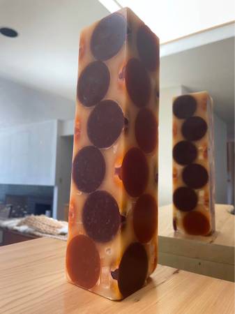 We have a 12” square tall candle for sale. This has never been lit and has a unique inlaid design of various wax colors. A small nick is on the bottom base of the candle.