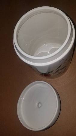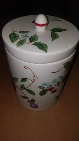 Never used, this hand painted StoneLite cookie jar features nice bright colors depicting various fruits and leaves on a buttercream background. The jar also has a latex gasket to keep goodies fresh.
