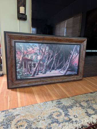 50"x 30" with a high quality frame. It has hooks and cable on the back.