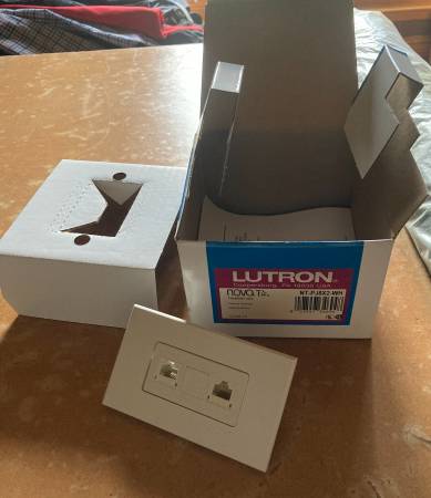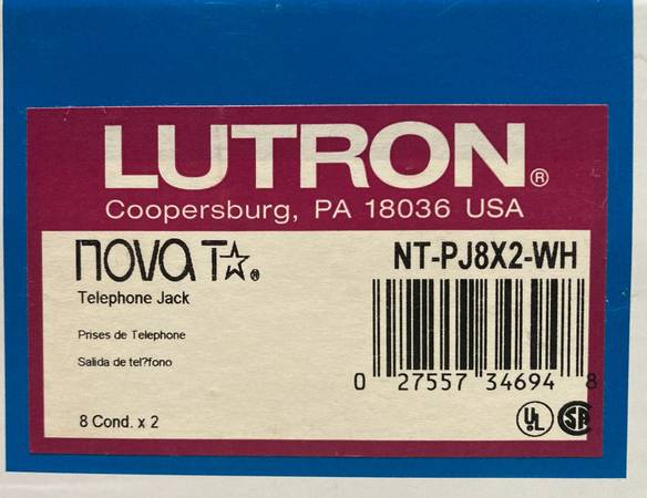 Item for sale is a NIB New In Box Lutron Nova-T "NT-PJ8X2-WH" Dual Telephone Jack in White. This item will cost you around $40 or higher if bought online (which will include tax and shipping) or from a dealer/store with their markup. Here you can get it brand new for half that price or less. I need to downsize so lots of these types of items MUST GO. Thanks for your consideration.