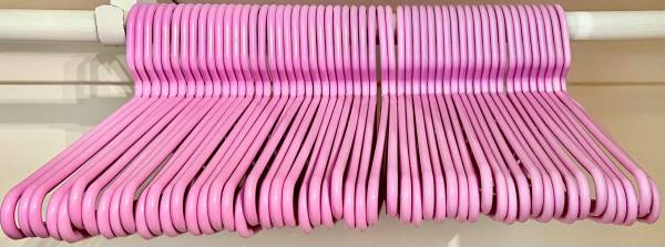 53 *PINK* PLASTIC ADULT CLOTHES HANGERS, Like-New! They're made of durable plastic and have a slim design to save closet space. Great for hanging various types of clothing.