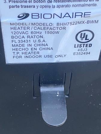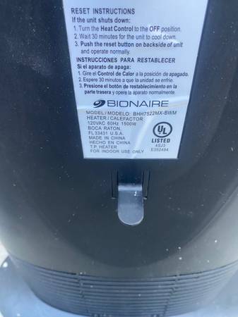 BIONAIRE SPACE HEATER MODEL BHH7522mx bwm ADJUSTABLE HEAT POSITIONS LONG CORD 27 INCHES TALL 12 INCHES WIDE IN GOOD WORKING CONDITION MUST SEE SEE ALL THE PICTURES CONTACT TOM AT