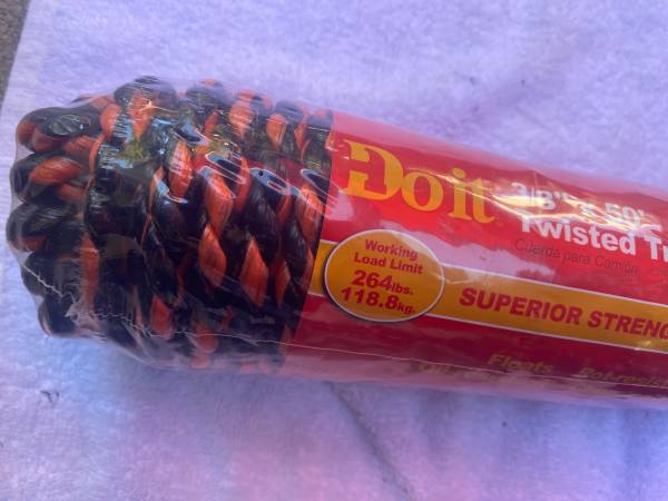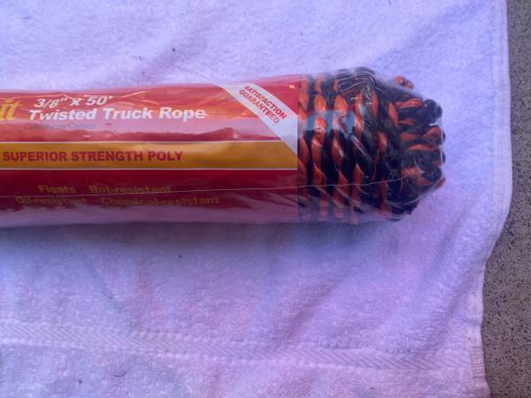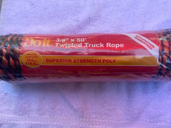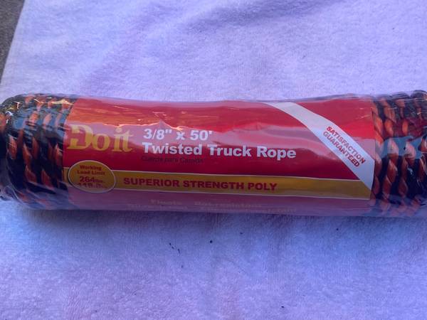 NEW UNOPENED STILL IN THE PLASTIC 3/8 X 50 FEET TWISTED TRUCK ROPE MADE BY DO IT MODEL 732745 MUST SEE SEE ALL THE PICTURES I ALSO HAVE OTHER NEW ROPES FOR SALE CONTACT TOM AT