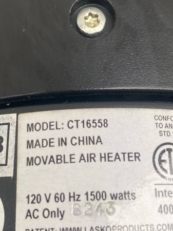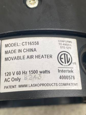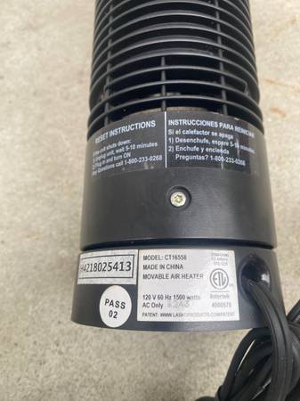 LIKE NEW LASKO MOVEABLE AIR HEATER MODEL CT16556 ADJUSTABLE HEAT POSITIONS 16 INCHES TALL 6 INCHES WIDE LONG CORD IN GOOD WORKING CONDITION MUST SEE SEE ALL THE PICTURES CONTACT TOM AT
