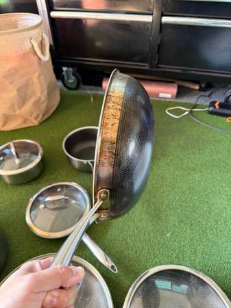 For sale is a set of used HEXCLAD hybrid cookware. They're in great condition, no dents or scratches cooking surfaces (I was too lazy to clean the pans before photos so some of them look damaged but it's just grease baked on). They are used so there are cooking stains that need to be cleaned. They just needs some tlc and bar keepers friend. Non-stick pans free from forever chemicals like PFAS and Teflon. I don't use them enough so selling them. I bought it a year ago as a set online for $1000. They're still under warranty. Below is what is included: