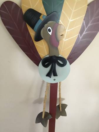 This VTG, wooden Thanksgiving Yard Stake is from New Creative Enterprises. The Turkey’s feet dangle from twine rope! It’s well made and sturdy. On the back, is a built in hanger for storage. It...