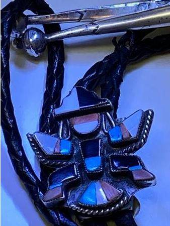 Fifth BOLO is a ZUNI Knifewing inlaid with turquoise, jet, mother of pearl, and spiny oyster shell measures almost 1 1/4" tall and 1 1/8" wide at widest point and hangs on leather with silver tips price is $80.00