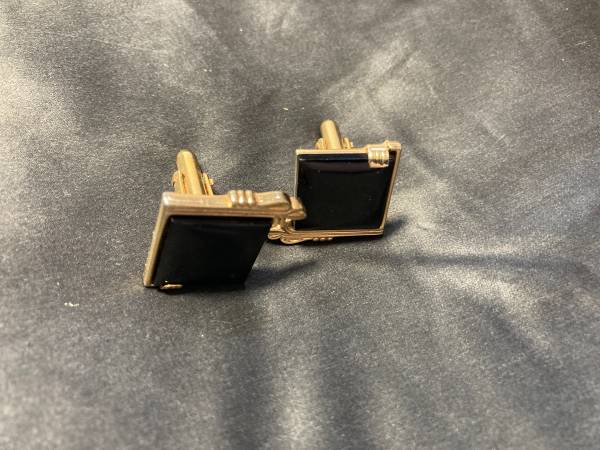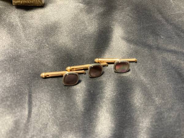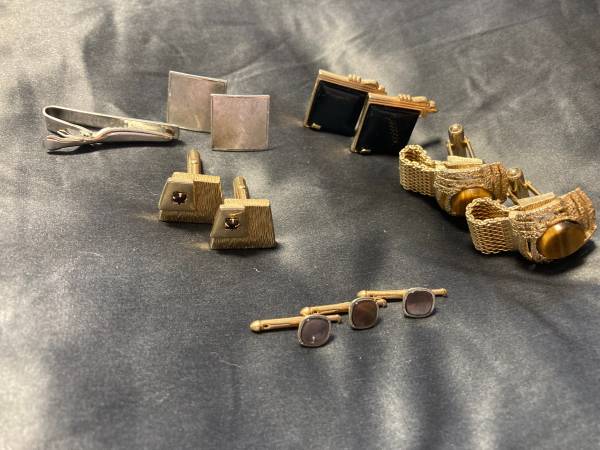 2 pairs of Swank cufflinks 1 pair gold color wraparound cufflinks 1 set of silver cufflinks and tie clip 3 Swank mother of pearl studs