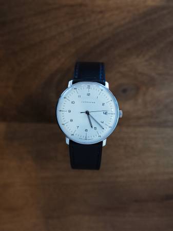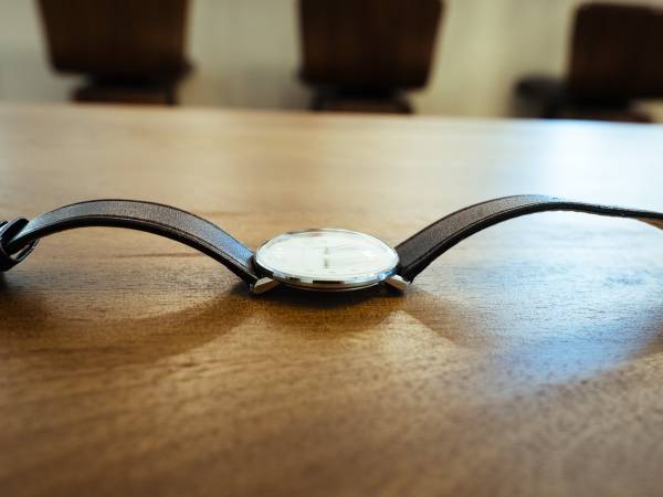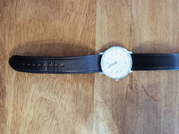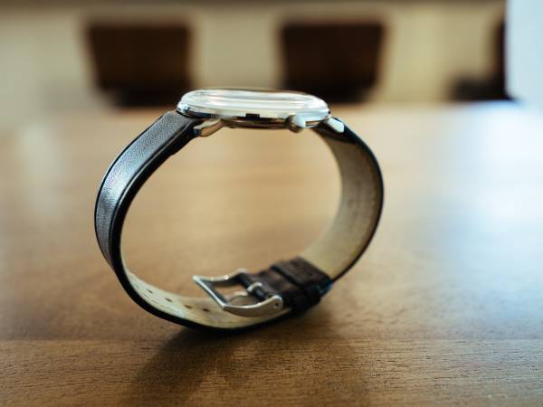 The case is stainless steel, 38mm diameter and ultra thin 7.9mm. This is an updated model that has sapphire glass. Dark brown leather strap. Lightly worn and in very good condition. No noticeable scratches other than some potential hairline scratches on the highly polished caseback.